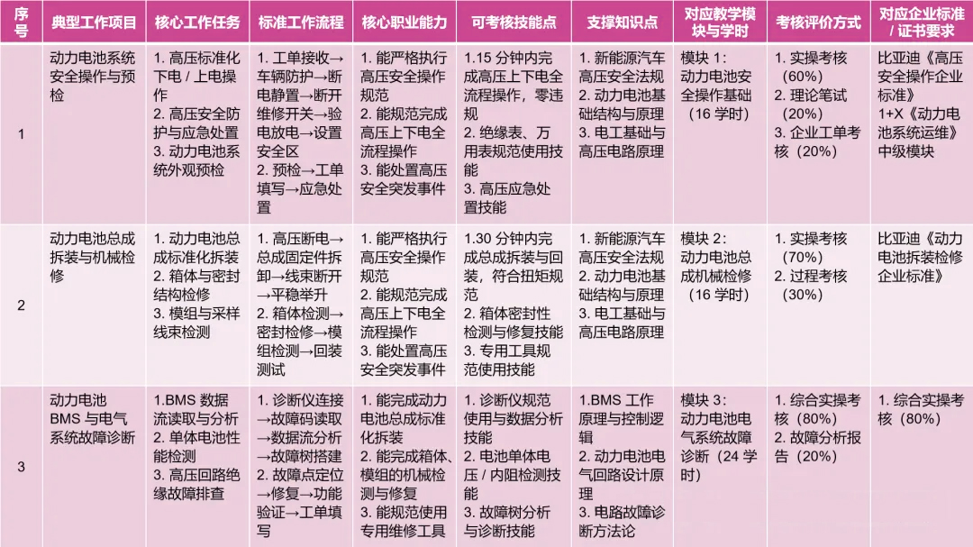 - 落地案例:《新能源汽车动力电池系统检修》课程,梳理出的核心工作项目包括:动力电池系统安全操作、动力电池总成拆装与机械检修、动力电池BMS与电气系统故障诊断、动力电池热管理系统检修、动力电池健康状态评估与综合维修。